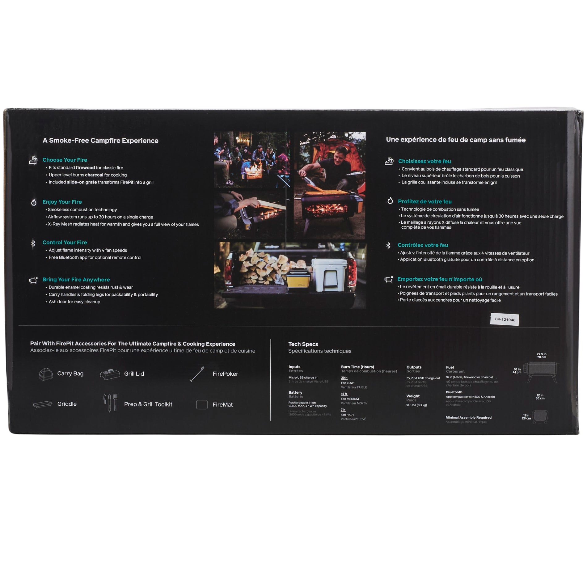Enjoy the warmth, smell, crackle, and feel of a wood campfire, without any of the smoke. Our latest upgrade to the award-winning BioLite FirePit creates hyper-efficient flames with patented airflow technology and gives you a front-row seat to the magic thanks to the X-Ray mesh body. Lift the fuel rack and toss in charcoal to transform it from a fire pit to a portable hibachi-style grill, complete with included grill grate. Control the size of your flames manually or remotely with the free Bluetooth app. Fuel: Burns firewood or charcoal.