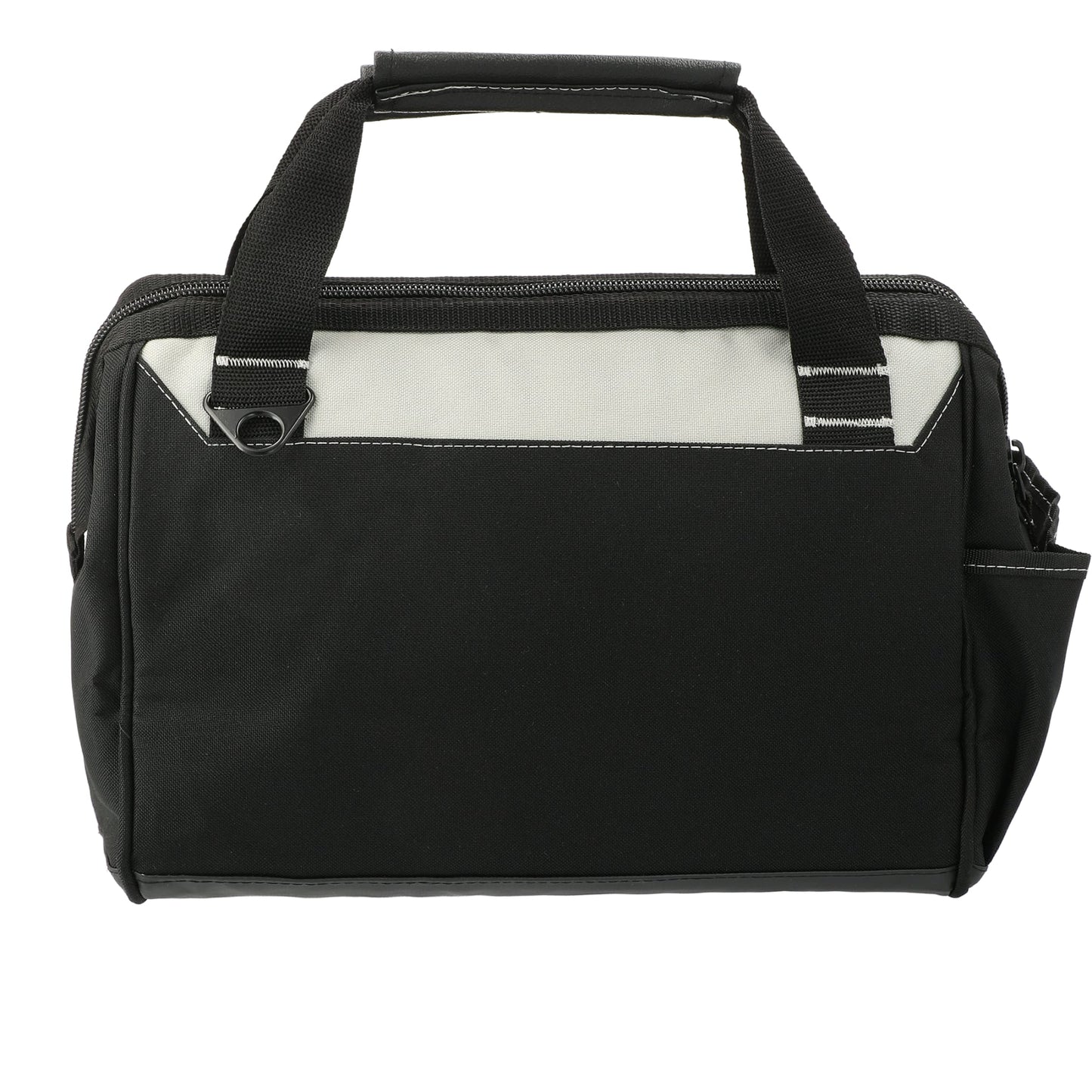 The Workmate 14" molded base tool bag is perfect for any tool enthusiast. Made out of 600D poly with a molded base this bag will stand up to the weight of all tools. It features 1 exterior side pocket, 1 front zipped pocket and a convenient water bottle front pocket. The metal wire frame provides easy access to the interior webbing loops that provide tool organization. This sturdy bag also has reinforced handle grips to provide durability while carrying. Includes padded carrying strap.